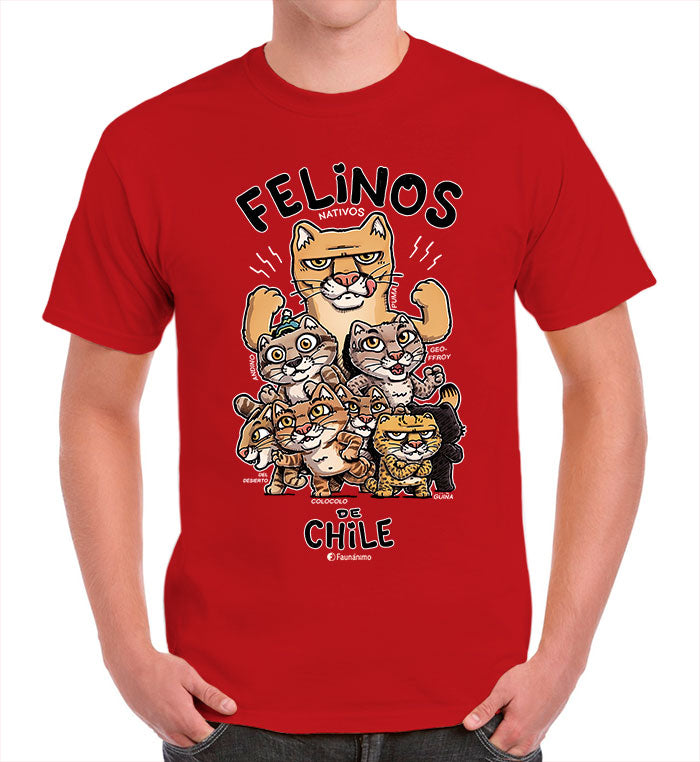 Polera PRO de algodón, con diseño ilustrado de Felinos de Chile. Polera de algodón estampada con dibujo full color, con diseño de todos los Felinos de Chile.